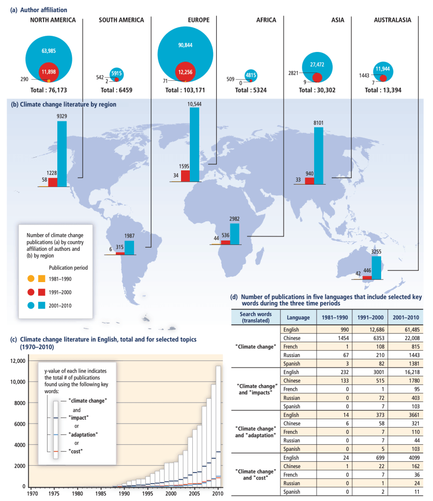 Un point de détail : les scénarios socioéconomiques comme les scénarios climatiques qui en résultent ci-dessus ne sont pas les « scénarios du GIEC », ils sont élaborés, sélectionnés et utilisés par les différentes communautés scientifiques. Le GIEC, lui, évalue et synthétise les résultats. Les derniers scénarios élaborés par le GIEC lui-même étaient les scénarios SRES, utilisés dans le troisième et le quatrième rapport d’évaluation. On peut cependant dire que le GIEC influence assez fortement le travail des communautés scientifiques, notamment au niveau de la temporalité des travaux.