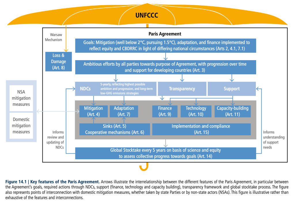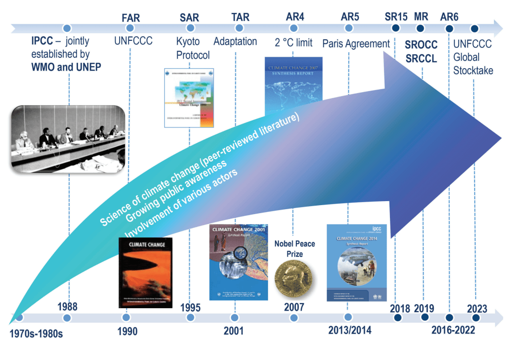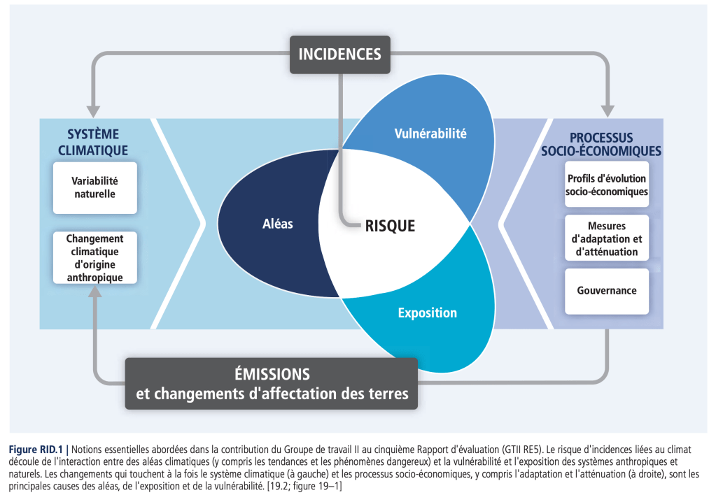 Le Rapport de synthèse de l’AR6, publié au printemps 2023, présente une figure résumant le cadre d’évaluation des projections, des impacts et de l’atténuation, que vous pouvez peut-être comprendre un peu mieux désormais :