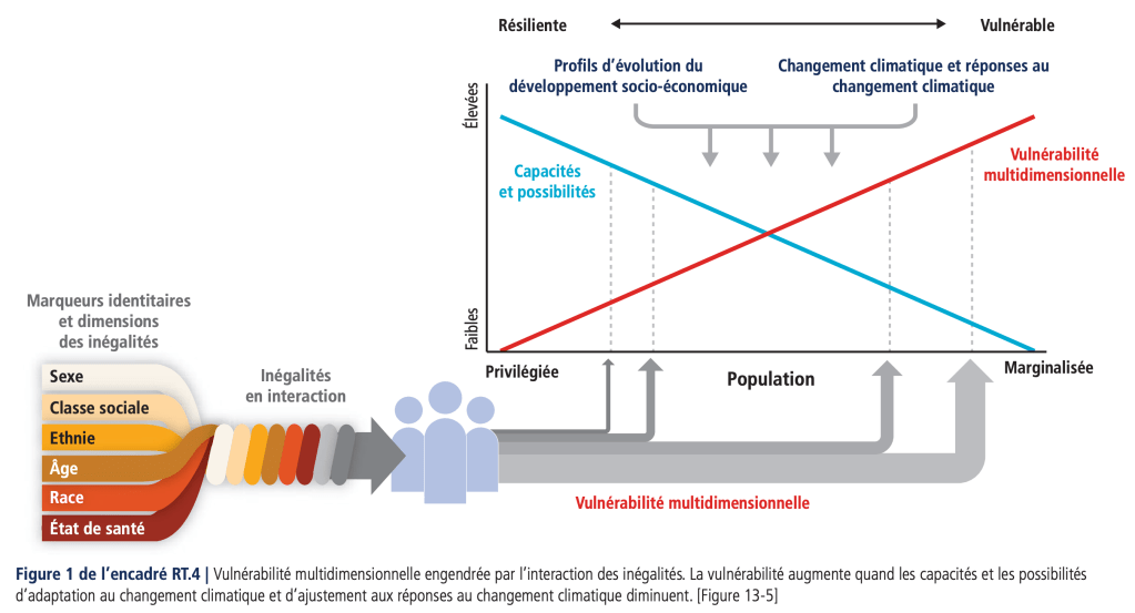 Les SSP ne sont donc pas des prévisions ou des prédictions de ce qu’il va se passer au cours du XXIème siècle : malheureusement, personne n’a de boule de cristal pour cela. Ce sont également, volontairement et par construction, des mondes développés tout d’abord « sans climat » (O’Neill et al., 2020). Deux raisons à cela : premièrement, ils servent de trajectoires de référence par rapport à d’autres où l’on aura « ajouté » le climat, que ce soit sous forme d’émissions ou d’impacts. Ensuite, leur intérêt repose dans les différences socioéconomiques entre les cinq trajectoires, qui permettent d’étudier les défis de chaque société pour l’atténuation et l’adaptation (axes verticaux et horizontaux sur la figure précédente de donneesclimatiques.ca).