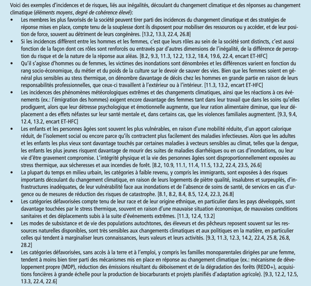 Également, les scénarios existants (SSPx-y et scénarios du WG3, qui reposent sur certains SSP) et les modèles qui les produisent sont critiqués pour leurs postulats implicites, notamment sur les questions de justice (Rivadeneira & Carton, 2022). L’un des principaux reproches concerne la répartition des efforts d’atténuation, qui est une question hautement politique (puisque dépendante du principe des responsabilités communes mais différenciées). Or, les IAMs utilisent généralement un prix du carbone global pour représenter l’atténuation, ce qui pèse plus fortement sur les économies fortement carbonées et/ou reposant sur l’exportation de combustibles fossiles (voir section 3.6.1.2). Les questions d’équité sont ainsi souvent ignorées ou implicites lors de l’élaboration des scénarios d’atténuation, qui se concentrent surtout sur les aspects technologiques. Dans une majeure partie de ces scénarios, en raison des postulats, les inégalités entre les pays du Sud et du Nord persistent (Kanitkar et al., preprint, Ranjan et al., preprint).