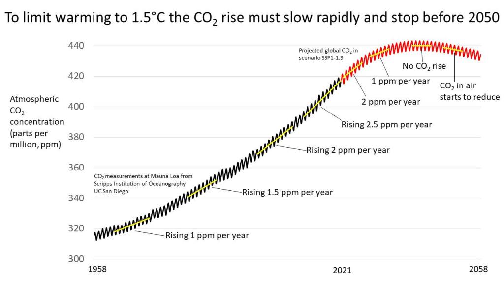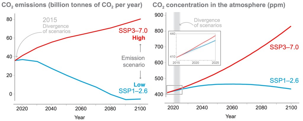 Les pointillés permettent de comparer aux projections des scénarios précédents utilisés dans l’AR5. Il faut noter que les scénarios « de référence » de ce rapport couvraient une plage commençant un peu au-dessus du RCP6.0 et allant légèrement au-dessus du RCP8.5 (en émissions de gaz à effet de serre, AR5, WG3, Fig. RID.4). Le point principal à retenir ici est que, même sans politiques climatiques, les émissions futures dépendraient de l’évolution socioéconomique des sociétés : il n’y a pas qu’une seule trajectoire « business as usual ». De plus, même le SSP1, sans politiques climatiques, conduirait à un réchauffement significatif (environ +3 °C – à noter que dans cet article, pour une meilleure compréhension, nous traduisons parfois les forçages radiatifs en élévation de température en fin de siècle, en utilisant les valeurs de l’AR6, WG1, tableau RID.1).