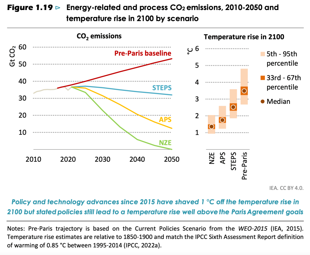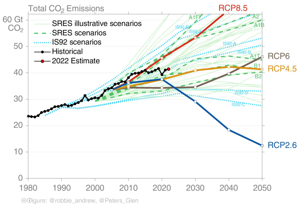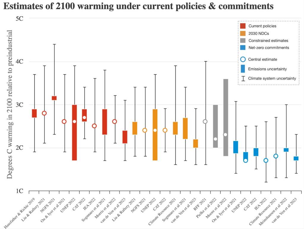 L’AR6 présentait les trajectoires pré-COP26 pour des raisons de timing de publication. Entre temps, le renforcement des politiques climatiques en place (Inflation Reduction Act aux États-Unis par exemple) et des engagements a eu des effets sur ces trajectoires. Le briefing paper de Meinshausen et al. (2022) fait la synthèse des différents travaux qui tentent de projeter les émissions des scénarios tendanciels. Plus récemment, Zeke Hausfather a regroupé sur une même figure ce type de projections, en distinguant les incertitudes associées aux émissions (en couleur) et celles liées au système climatique (barres noires) :
