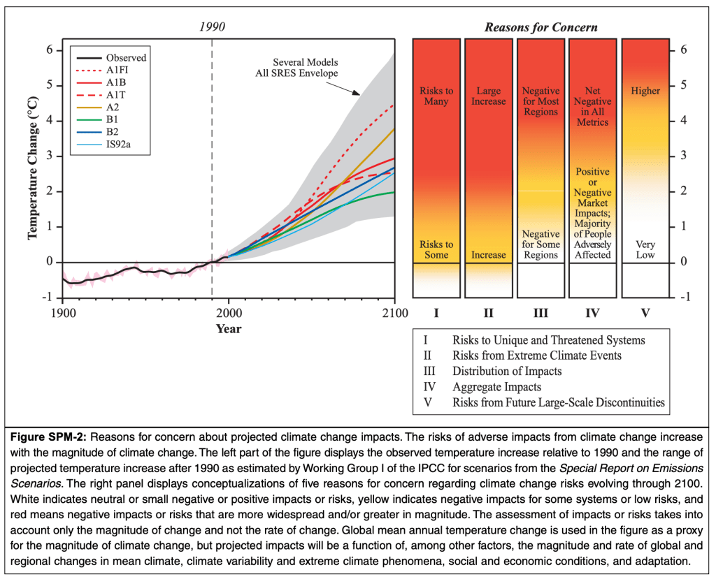 Cette figure permet de s’y retrouver entre les différents scénarios d’émissions (à gauche), les projections de réchauffement associées (au milieu), et les niveaux de risques liés à différents niveaux de réchauffement (évalués par le groupe 2 avec les diagrammes « burning embers », ici à droite).