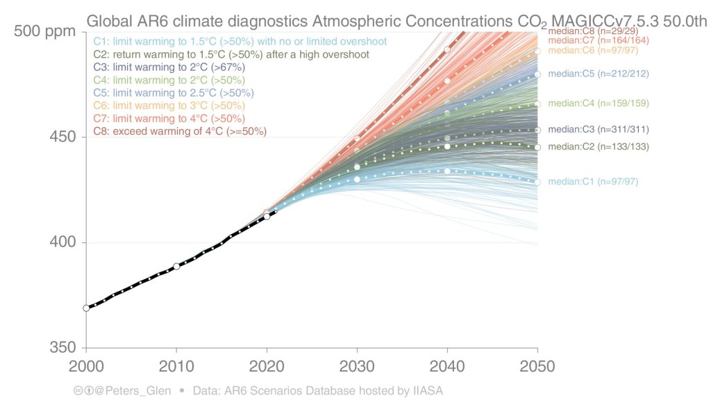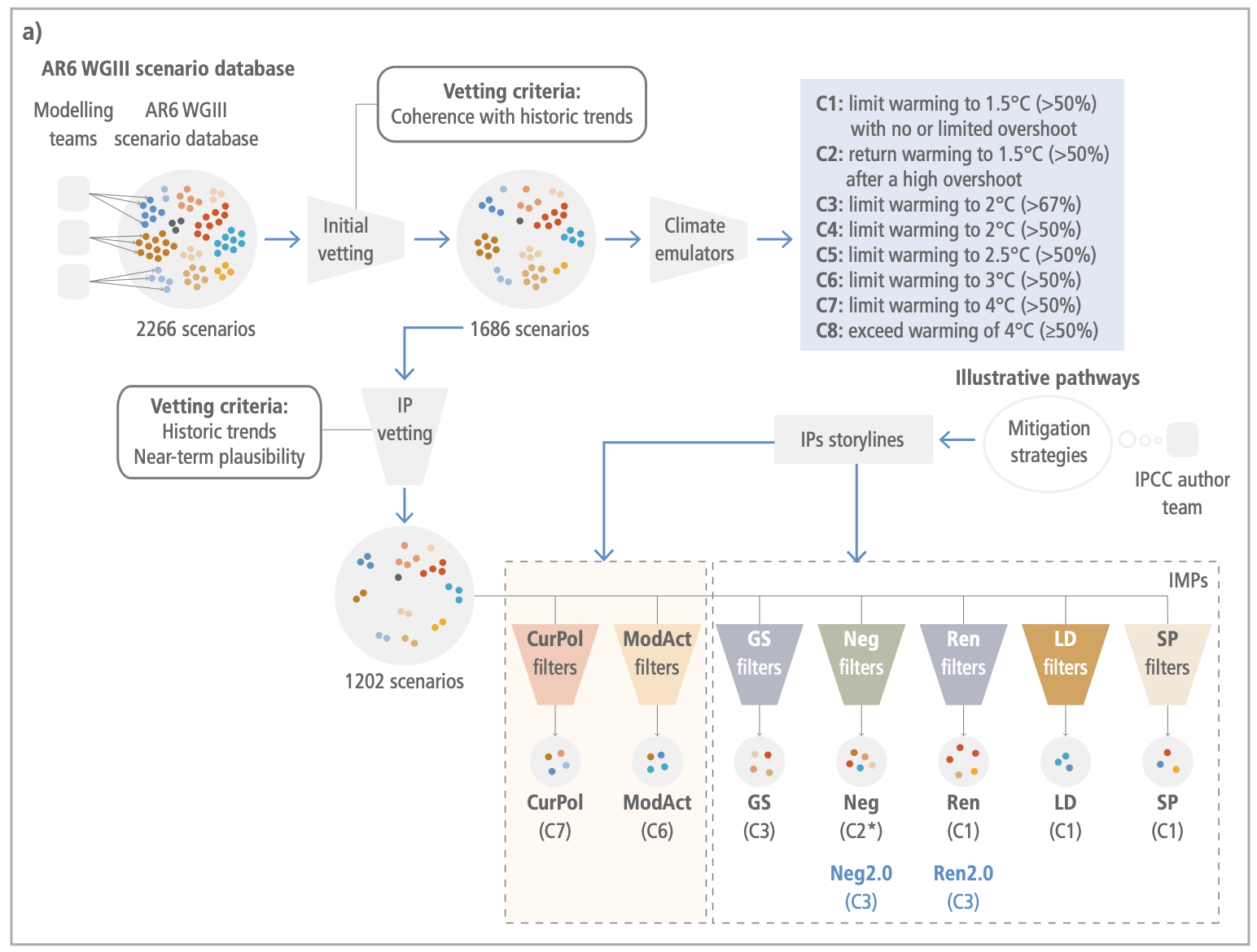 Plus de 3000 scénarios élaborés par des dizaines de modèles ont été ainsi déposés dans la base de données du groupe 3 du GIEC, en préparation de l’AR6. Les auteurs du rapport ont mis en place des critères de sélection (cohérence avec les tendances récentes, probabilité à court terme, etc., voir Peters et al., 2023) et en ont retenu 1202, qui ont été triés en fonction du réchauffement qu’ils provoquent en 2100 (avec l’aide d’un émulateur, un petit modèle climatique qui permet de « reproduire » les résultats des gros) : ce sont les catégories de scénarios, de C1 à C8, mentionnées sur la figure ci-dessous qui décrit ce processus (WG3, chap.3, Fig. 3.5a).