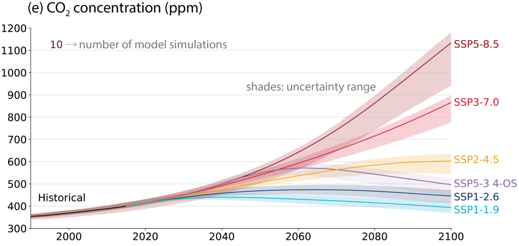 – Les anciens scénarios RCP de l’AR5 (quatre trajectoires d’émissions illustratives) que l’on peut encore parfois trouver dans des travaux,