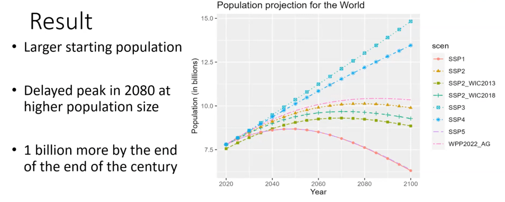 Ce sont d’autres projections, démographiques et économiques, qui étaient en cours de revue le mois dernier. Elles formeront, après corrections et publication, les nouvelles données des SSP. Leurs auteurs les ont présentées durant un webinaire dédié du projet ICONICS. Voici un extrait de la présentation de Samir KC, pour les projections de population, qui sont encore préliminaires (version finales visibles ici sur l’Explorer de l’IIASA) :
