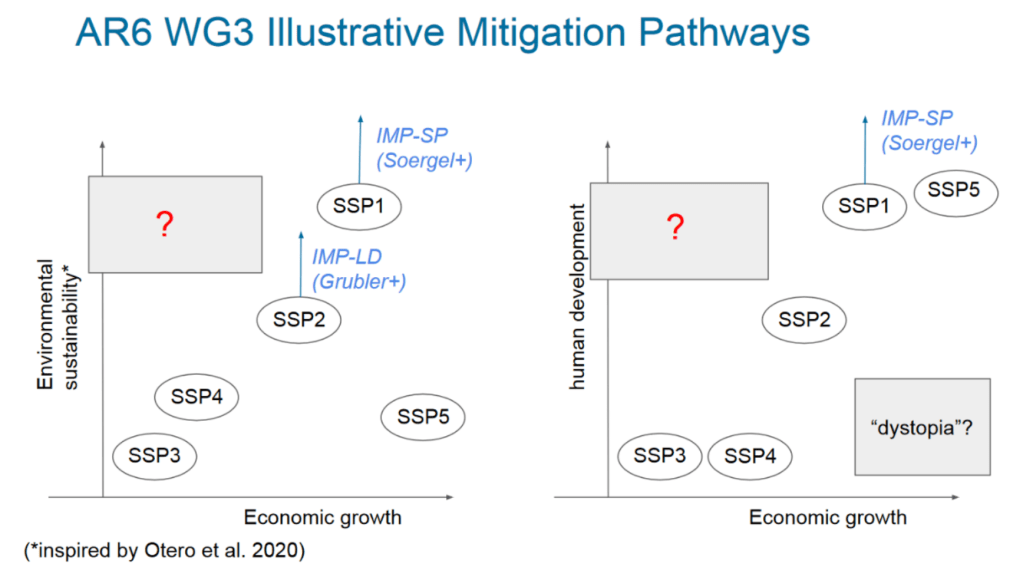Le Scenarios Forum 2022 a d’ailleurs identifié un manque pour un SSP « qui n’associe pas automatiquement un niveau élevé de développement humain et de durabilité environnementale à une forte croissance économique » (Meeting report, p. 72). Ce manque est illustré dans la figure ci-dessous provenant de la synthèse de la session sur la post-croissance, inspiré par le « SSP0 » de Otero et al. (2020) :