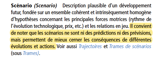 Avant de continuer cet article, un point épistémologique important, que nous nous permettons de mettre en majuscule car il s’agit d’une incompréhension récurrente : « LES SCÉNARIOS NE SONT NI DES PRÉDICTIONS NI DES PRÉVISIONS » (GIEC, WG1, Glossaire, définition complète ci-dessous). Ce sont des exercices servant à évaluer « ce qu’il se passerait si » on suit telle ou telle trajectoire, afin d’aider à la prise de décision, et non des tentatives de prédire le futur. C’est pour cela qu’il y a des ensembles de scénarios : cela permet, du moins d’essayer, de couvrir l’ensemble des possibles, en particulier pour l’évaluation du risque.