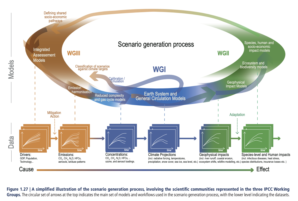 Nous avons donc les propriétés de cinq mondes qui évoluent différemment avec les émissions de gaz à effet de serre et aérosols associés, à la fois en trajectoire de référence et pour différents niveaux d’atténuation. Il s’agit de la première étape de l’élaboration des projections climatiques, comme le décrit bien la figure suivante (GIEC, groupe 1, chapitre 1) :