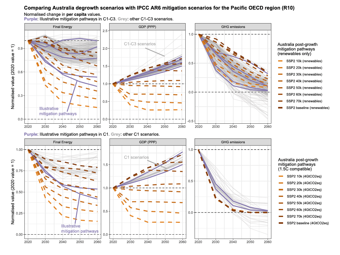 De nombreuses études sont en cours de travail sur ces enjeux de décroissance, post-croissance et changement climatique. Il y a eu une session dédiée au Scenarios Forum 2022, une grande conférence rassemblant la plupart des chercheurs travaillant sur les questions abordées dans cet article (voir la session #37). Y étaient présentés des travaux sur le système alimentaire (Bodirsky et al., 2022), une tentative de modifier la fonction de production d’un IAM, une autre de la fonction d’utilité. Ce dernier travail vient d’être publié (Li et al., 2023, et un autre lié est en preprint, Kikstra et al.) : en limitant le niveau de consommation par personne à différents niveaux, le modèle permet d’analyser des trajectoires aussi bien croissantes que décroissantes pour le cas de l’Australie (ci-dessous, fig. 8). Ce n’est qu’un début avec de nombreuses limitations et simplifications, mais c’est un axe de recherche prometteur pour explorer d’autres voies.