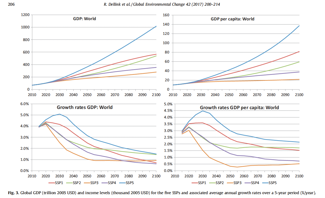 Dans l’article, Dellink et ses coauteurs expliquent que leur modèle repose sur un modèle économique de Solow « augmenté », c’est-à-dire que la croissance économique est due essentiellement à la productivité globale des facteurs, i.e., le progrès technique (notamment l’amélioration de l’efficience énergétique). Ce dernier finit cependant par atteindre une limite, propre à chaque pays. Le modèle de Solow, néoclassique, est parfois considéré pour cette raison comme ayant une croissance « exogène », du moins, il n’explique pas entièrement d’où elle provient. Ce modèle prévoit cependant l’atteinte d’une économie « stationnaire » à (très) long terme, où la population serait alors le principal déterminant de l’activité économique.