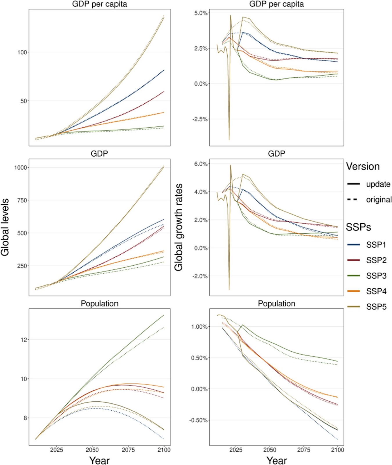 Les scénarios SSP ont été élaborés dans les années 2010, et les projections commencent autour de 2010/2015 selon les postulats (2018 pour les projections économiques de Dellink et al., 2017). Depuis, des mises-à-jour des données économiques historiques ainsi que de nouvelles projections démographiques ont été publiées, tandis que des événements significatifs ont modifié les trajectoire de court terme (Covid, guerre en Ukraine). En vue de la production des futures projections climatiques pour l’AR7, il est nécessaire de mettre à jour les projections de population et de PIB des SSP. Le travail a été entamé par les chercheurs il y a plus d’un an, et nous en sommes à la revue des résultats, qui a eu lieu au cours du mois d’août 2023.