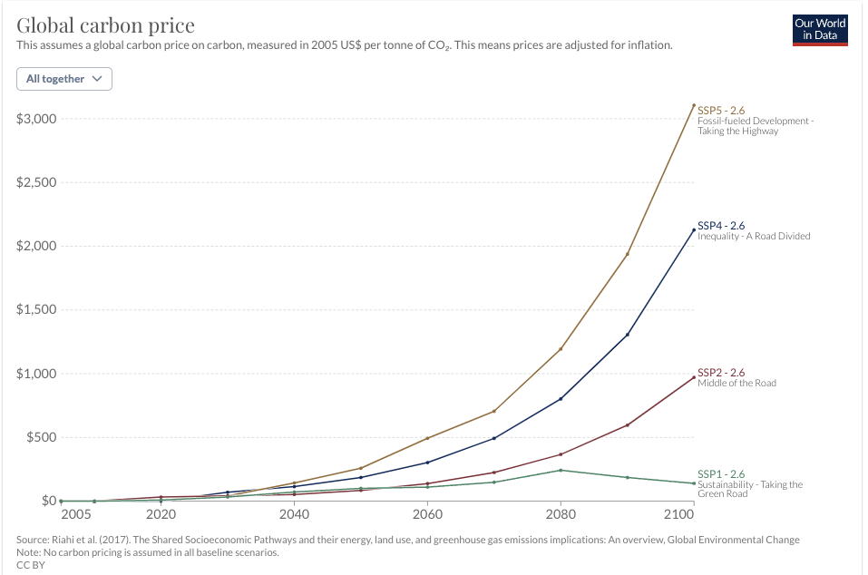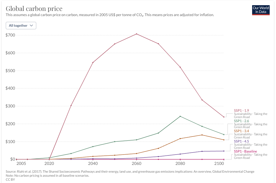 On observe bien ici les différences de consommation énergétique entre les SSP dues à leurs narratifs, puis leurs effets à la fois sur les évolutions du mix, et sur la difficulté d’atteindre des niveaux de forçage radiatif inférieurs (avec notamment, dans certains cas, l’utilisation intensive de capture de carbone). La case vide en bas et au milieu montre qu’ici, le modèle ne parvient pas à obtenir une trajectoire atteignant 2,6 W/m2 pour le SSP3. Ne regardez pas de trop près le détail de ces mix énergétiques, c’est surtout pour expliquer la façon dont fonctionne un modèle : il y a beaucoup plus d’éléments pertinents à analyser sur ce sujet dans le rapport du groupe 3, qui évalue et synthétise des dizaines de projections de ce style. Si vous souhaitez aller plus loin sur la question, l’article de Rogelj et al. (2018) sur la modélisation d’un forçage radiatif de 1,9 W/m2 (respectant l’objectif de l’accord de Paris, soit environ +1,4 °C en 2100) montre les difficultés des différents IAMs à atteindre ce niveau en fonction des SSP. L’idée générale, qui ressort du fonctionnement de ces modèles, c’est que plus on cherche à atteindre un forçage radiatif bas, plus le prix du carbone va être élevé, afin de rendre compétitifs rapidement les moyens de production d’énergie moins carbonés. De plus, le prix augmente plus fortement pour certains SSP où la décarbonation est plus difficile pour des raisons économiques et technologiques, tandis que l’on part parfois de plus haut, c’est-à-dire que les émissions et le forçage radiatif de référence de ces SSP sont plus élevés (Riahi et al., 2017 ; Rogelj et al., 2018).