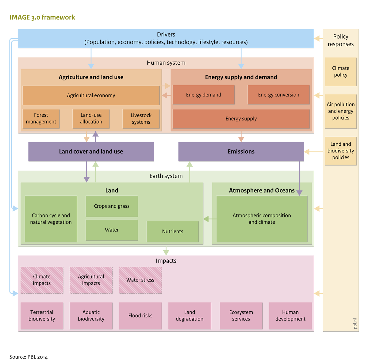 Nous le mentionnions précédemment, le but des SSP est de pouvoir analyser les différents défis pour l’atténuation des émissions et l’adaptation aux impacts du changement climatique, pour différentes trajectoires des sociétés (O’Neill et al., 2013). Ainsi, les postulats quantitatifs et qualitatifs des cinq scénarios que nous venons de voir servent de données d’entrée aux modèles d’évaluation intégrée (Integrated Assessment Models ou IAMs, voir l’article explicatif de Carbon Brief). Ceux-ci permettent de projeter les trajectoires d’émissions de gaz à effet de serre et autres polluants (aérosols notamment) ainsi que les changements d’usages des terres de ces différents scénarios. En résumé, un IAM est une machine compliquée qui représente les interactions entre la société, ou plus précisément des secteurs (énergie, agriculture, économie, etc.), et le système Terre. Il est possible d’ajouter aux postulats de départ des mesures, afin de représenter des politiques climatiques par exemple, ce qui permet d’étudier leurs effets sur les trajectoires d’émissions par rapport à celles de référence. Il est également possible, en fonction des modèles, d’étudier certains impacts. Il existe de nombreux IAMs différents, globaux ou régionaux. Voici une figure représentant l’un d’entre eux en version simplifiée, IMAGE 3.0 :