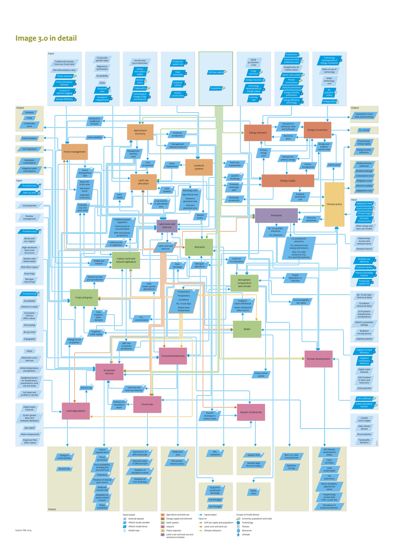 On observe en bleu au sommet les données d’entrée (« Drivers », c’est-à-dire les différents postulats et données des SSP de développement économique, démographique, technologique, d’usage des terres, etc.), à droite en jaune les possibles mesures, puis les différentes composantes du modèles qui interagissent : sociétés (agriculture et énergie essentiellement ici), système Terre, impacts. Les résultats principaux sont les trajectoires des émissions et des usages des terres sur la période simulée. Cette version simplifiée cache une certaine complexité du modèle, dont voici la version complète :