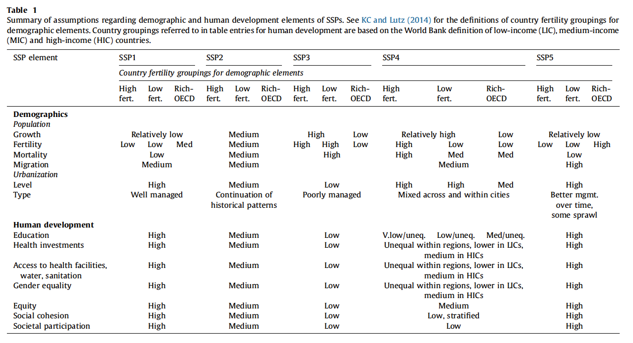 Ces scénarios sont composés de postulats qualitatifs concernant différentes dimensions (démographie, développement, progrès technologique, modes de vie, commerce international, institutions, relation à l’environnement, etc.) établis à partir des narratifs par plusieurs communautés scientifiques : démographes, économistes, urbanistes, etc. (voir l’article explicatif de Carbon Brief). En voici certains, provenant de l’article de O’Neill et al., 2017 (voir l’article complet pour les autres postulats, dans les tableaux 2 et 3) :