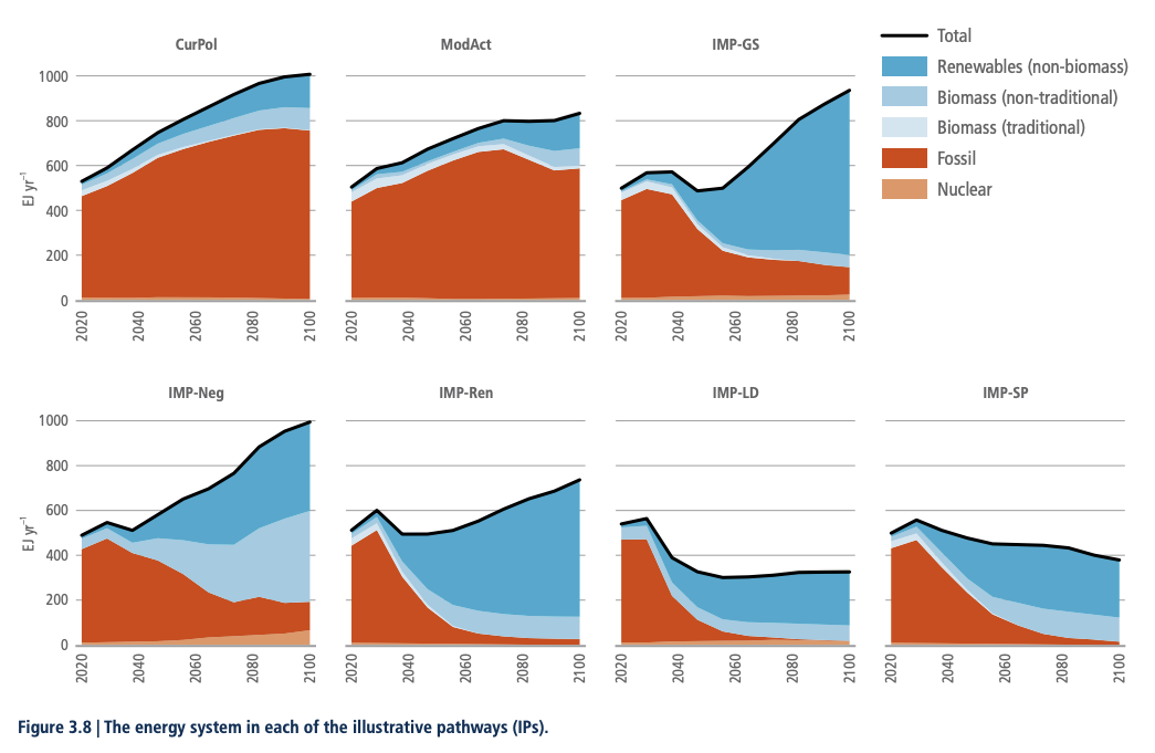 Pour pouvoir tirer quelque chose de ces nombreux scénarios, c’est-à-dire comparer leurs caractéristiques et leurs conséquences, les auteurs ont présenté sept trajectoires « illustratives » (Illustrative Pathways, IP) : deux tendancielles limitant le réchauffement à, respectivement, +4 °C et +3 °C, « politiques actuelles », « action modérée » ; et cinq d’atténuation (Illustrative Mitigation Pathways, IMP), aux postulats bien distincts, « renforcement progressif » (+2 °C), « émissions négatives » (+1,5 °C avec dépassement), « renouvelables », « faible demande » et « changement de trajectoire » (+1,5 °C avec peu ou pas de dépassement).