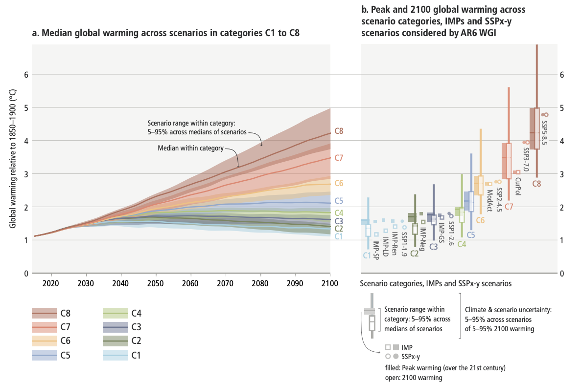 – Les centaines de scénarios d’atténuation du groupe 3 (utilisant des SSP comme « base » pour explorer différentes trajectoires d’émissions), triés par catégorie de réchauffement (C1 à C8) et synthétisés en une poignée de scénarios illustratifs (IP et IMP).